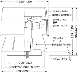 ●分布曲線補正板つきの羽根及び増圧風向制御板の採用により約31〜82・/分の吸・排気量を確保 することに成功。しかもMTH樹脂製なので高温にも強くねじれなどによる変型のおそれはありません。